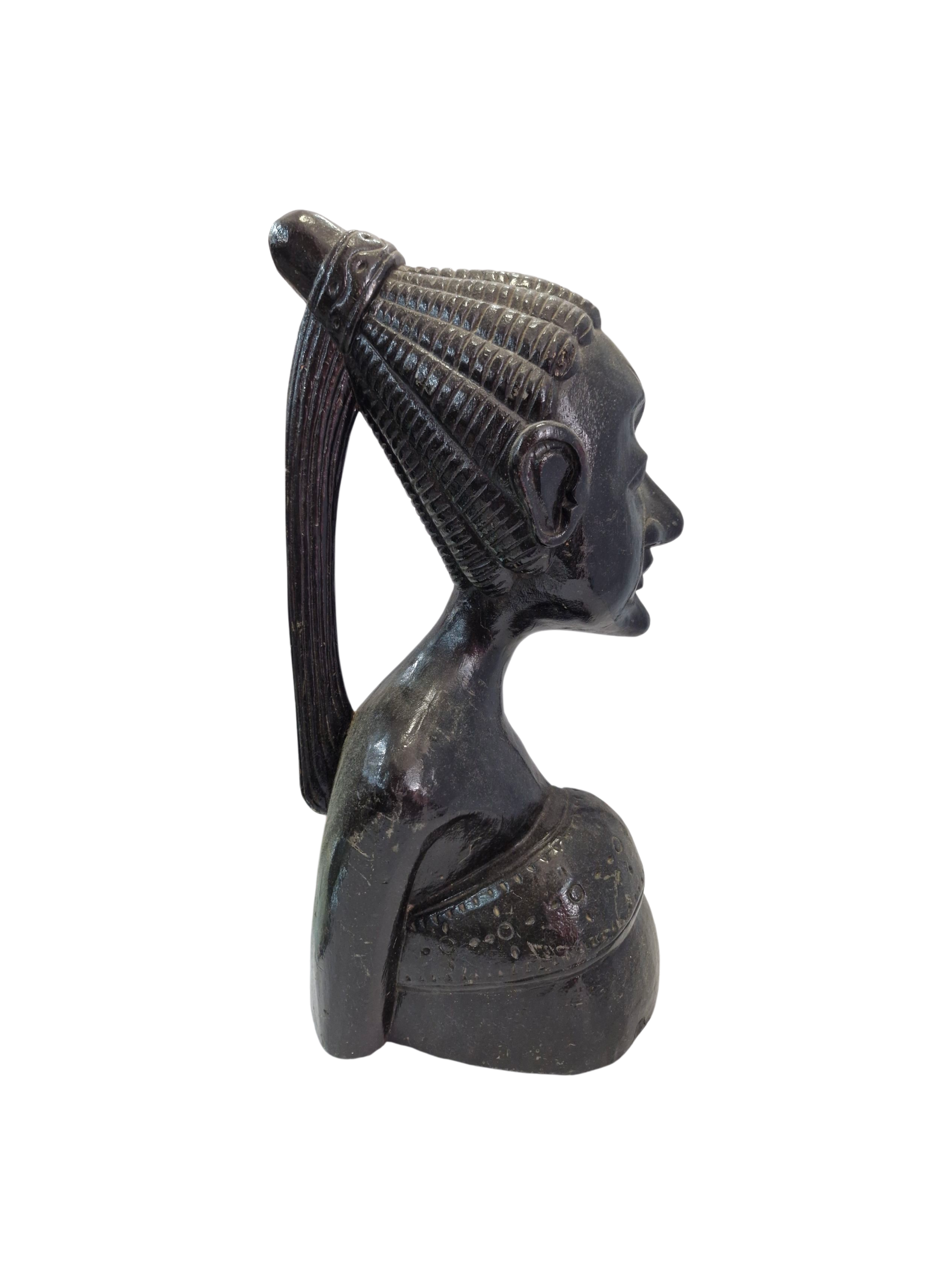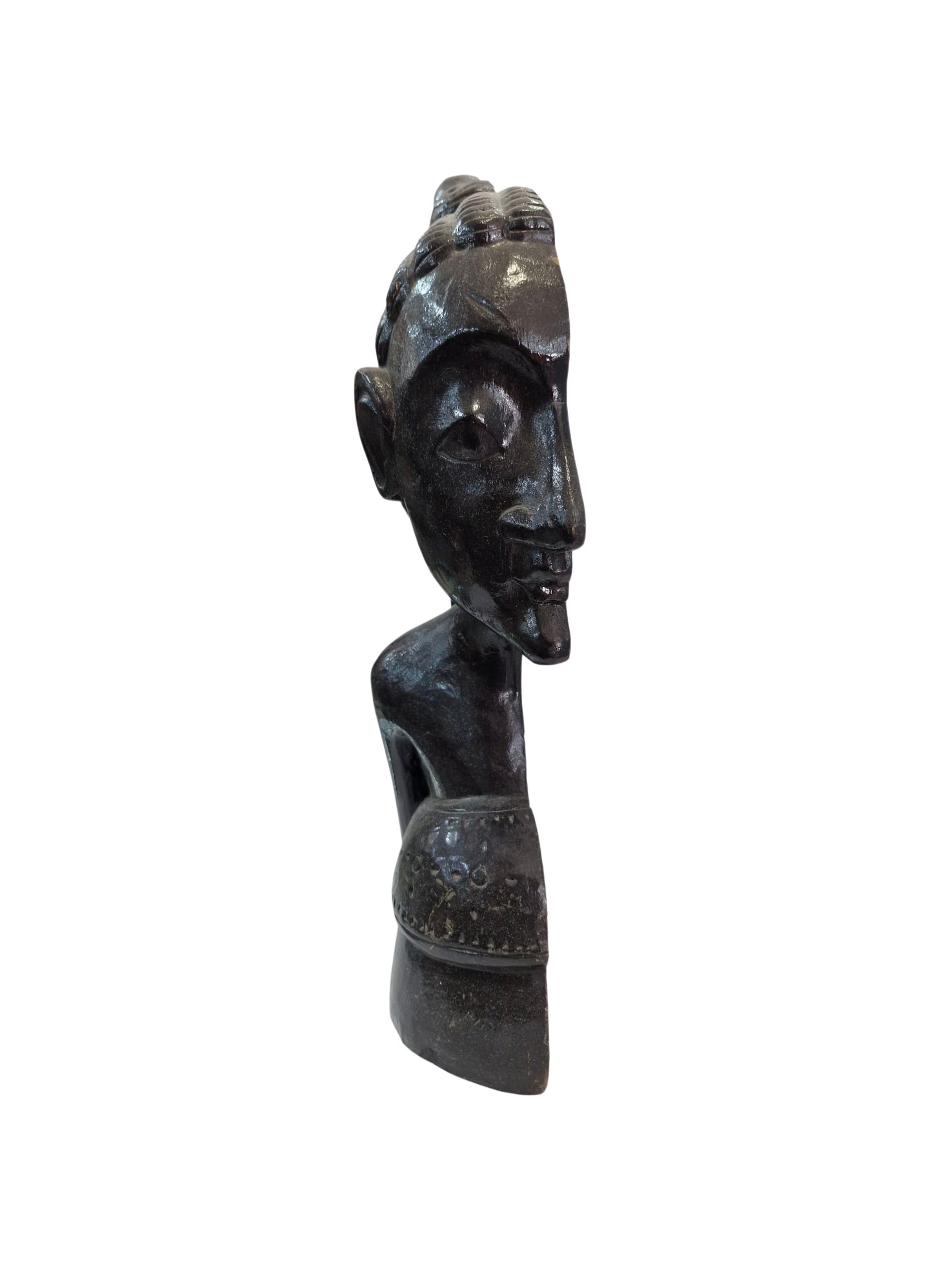 Escultura artesanal de busto humano tallada en madera oscura, con rasgos faciales estilizados y peinado tradicional. La pieza refleja el arte tribal africano, con detalles decorativos en el torso y acabado pulido. Ideal para colección de arte étnico o decoración con carácter cultural.