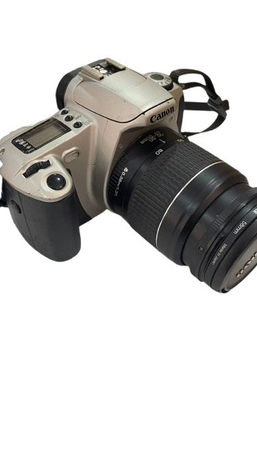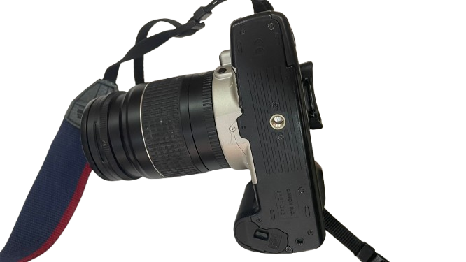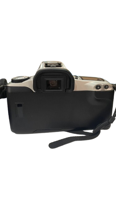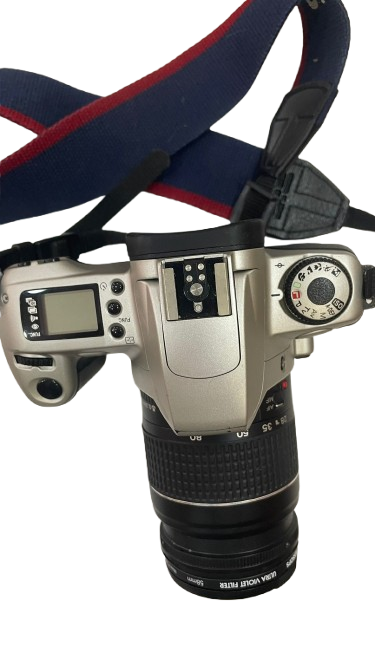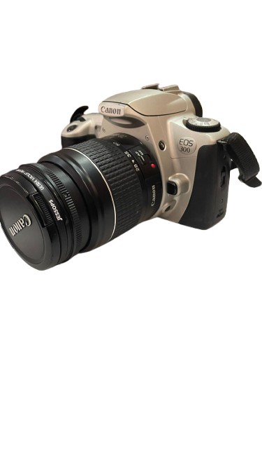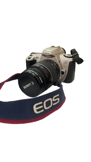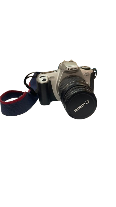 Cámara analógica Canon EOS 300 en excelente estado, con lente Canon incluido y correa azul con bordes rojos. Perfecta para los amantes de la fotografía clásica.