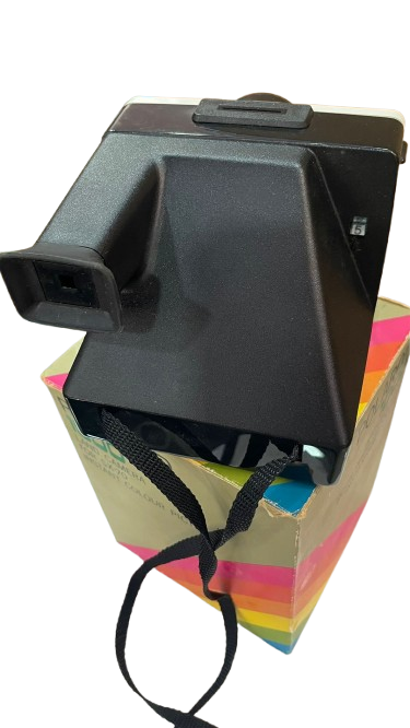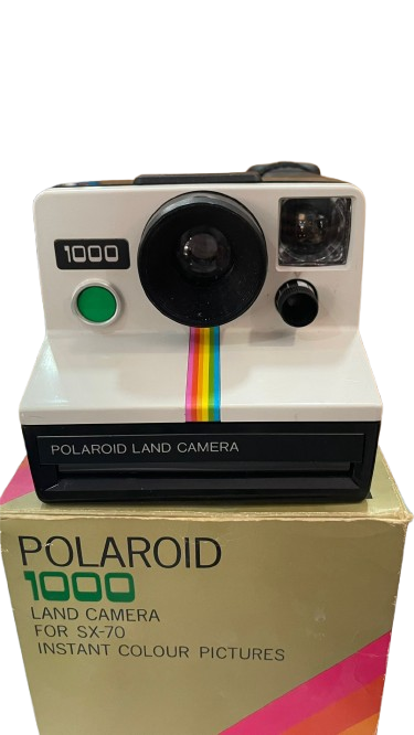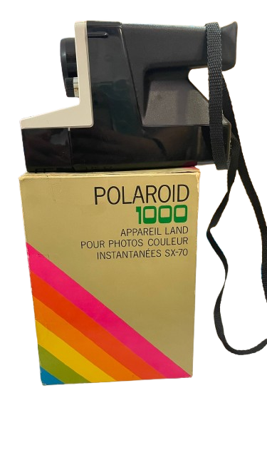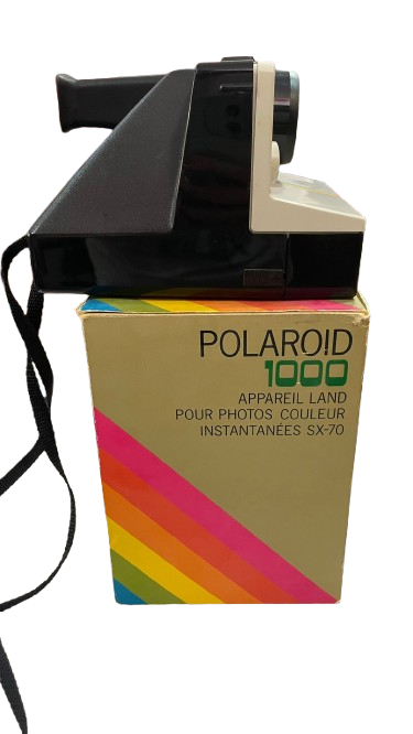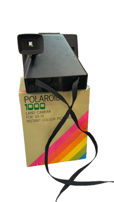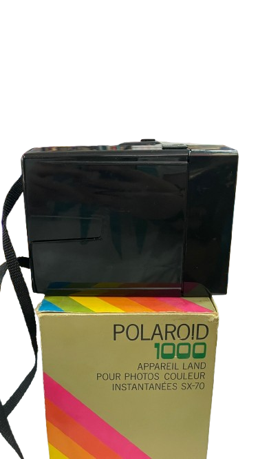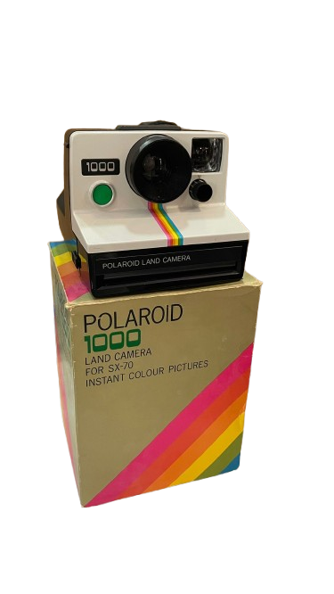 Esta imagen muestra una cámara Polaroid 1000 Land, un modelo clásico que revolucionó la fotografía instantánea. Su diseño retro y la caja original la convierten en una pieza única para coleccionistas y amantes de la fotografía vintage.