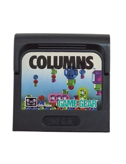 La imagen muestra un cartucho de juego de Sega Game Gear para el videojuego Columns. Se trata de un cartucho, un disco físico que contiene un videojuego portátil. La etiqueta del cartucho lleva el título «COLUMNS» en letras grandes.