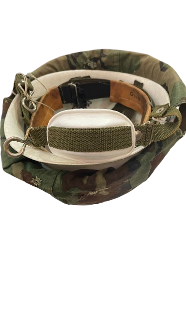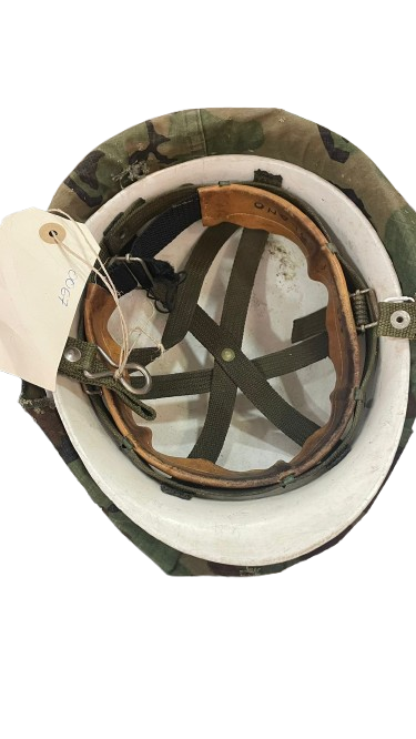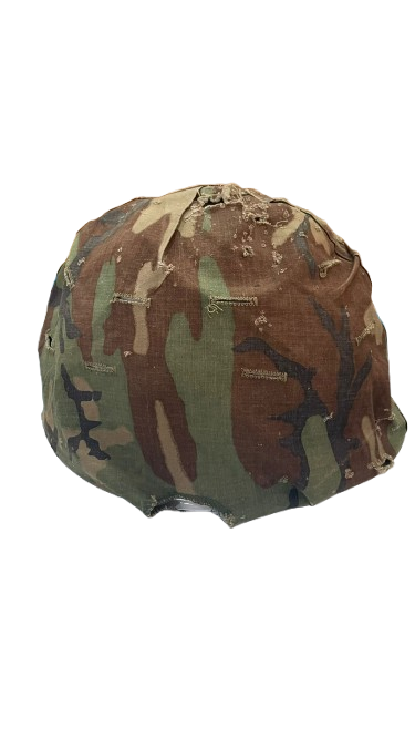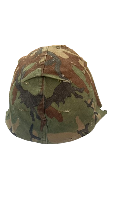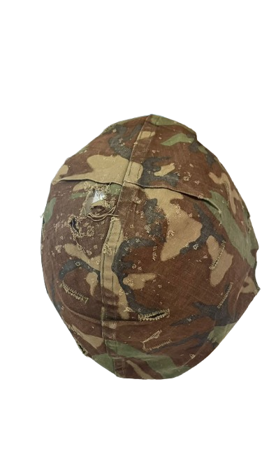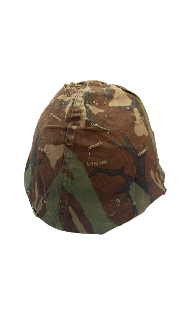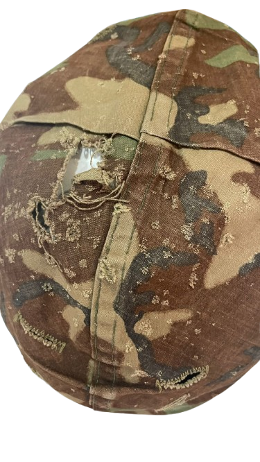 Casco militar utilizado, cubierto con una funda de camuflaje que muestra signos de desgaste y reparaciones. Es un objeto ideal para coleccionistas de antigüedades militares o amantes de la historia.