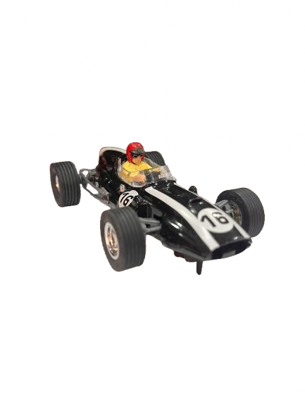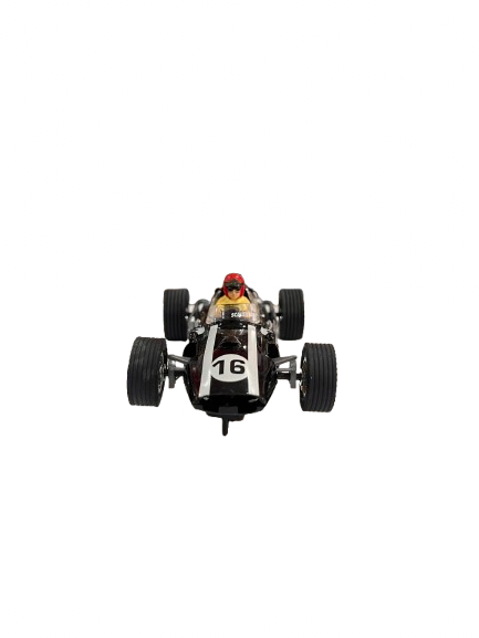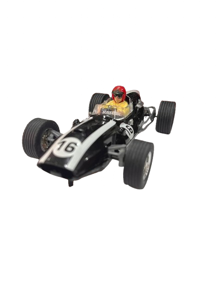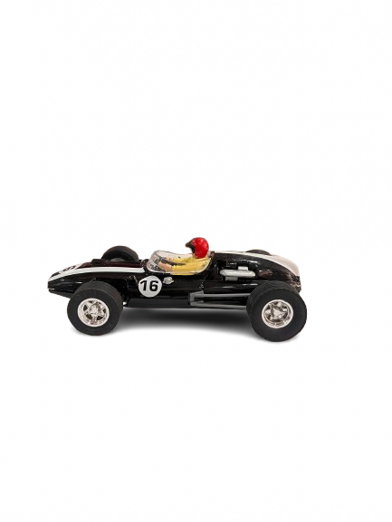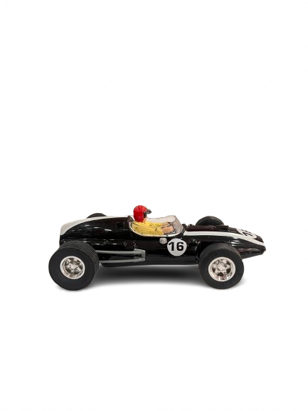 Este coche de carreras clásico en miniatura es una réplica detallada del modelo número 16. Con su elegante diseño en negro y blanco y un piloto con casco rojo y traje amarillo, este coche es perfecto para los aficionados a las carreras y coleccionistas de modelos de coches. Sus ruedas grandes y el diseño aerodinámico lo convierten en una pieza llamativa para cualquier colección.