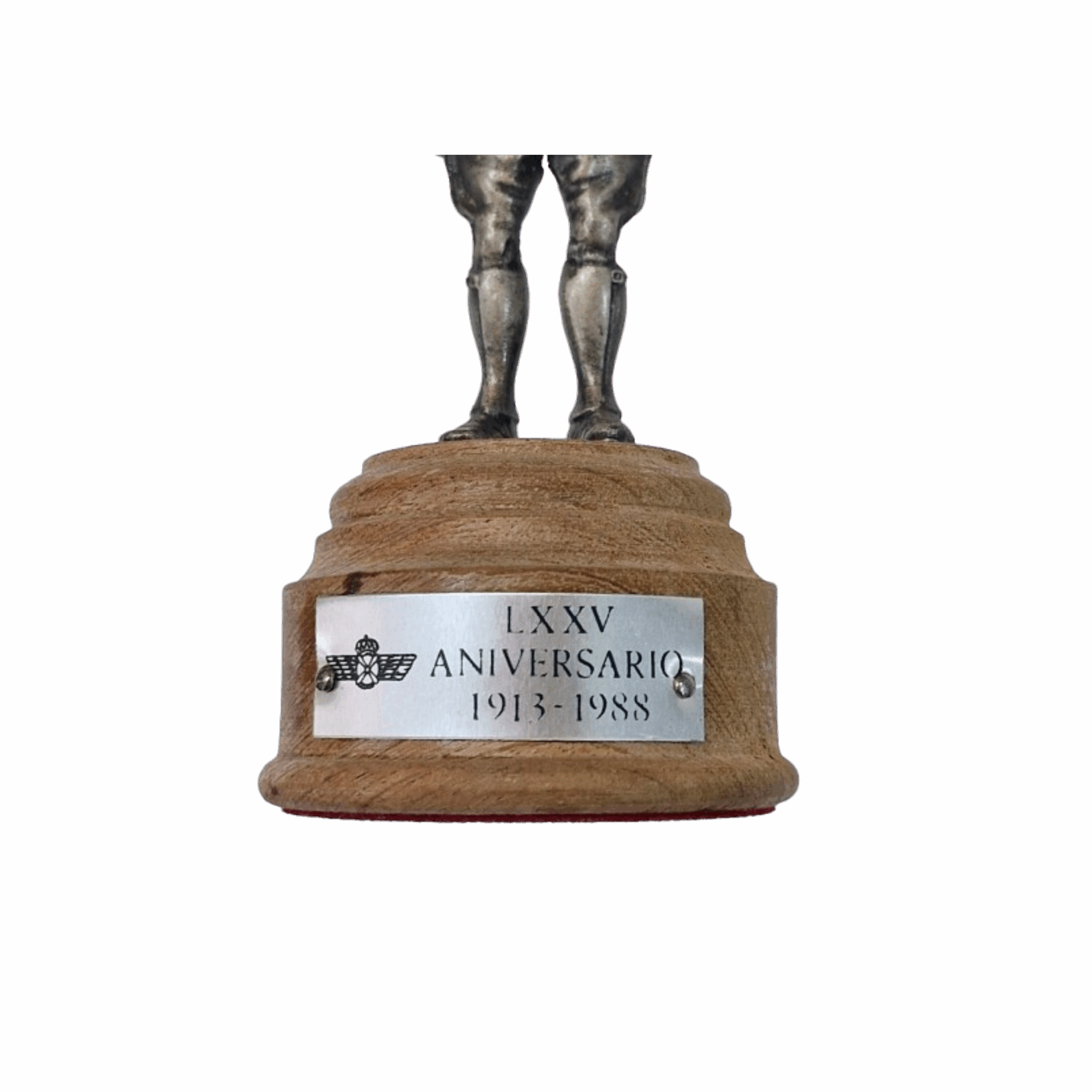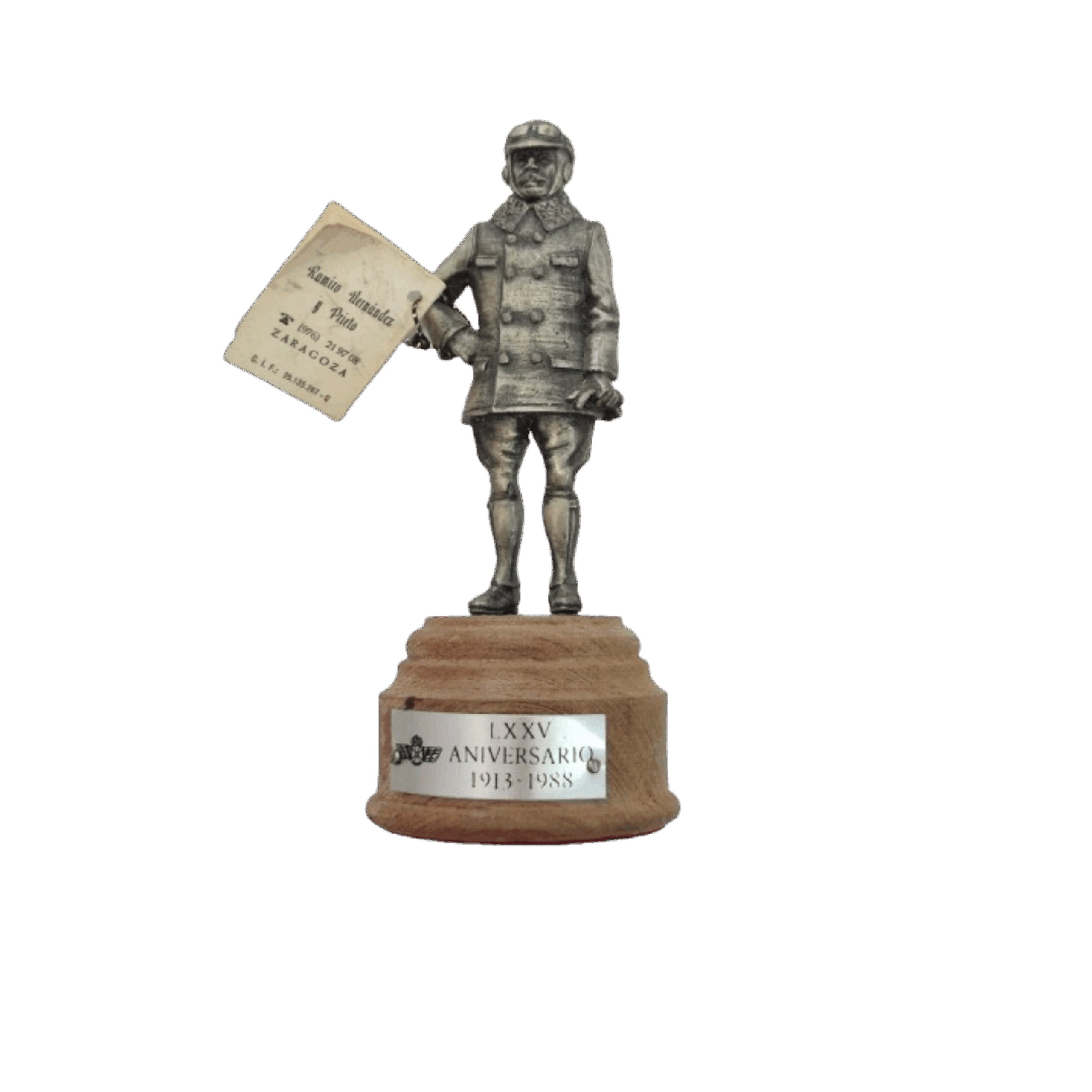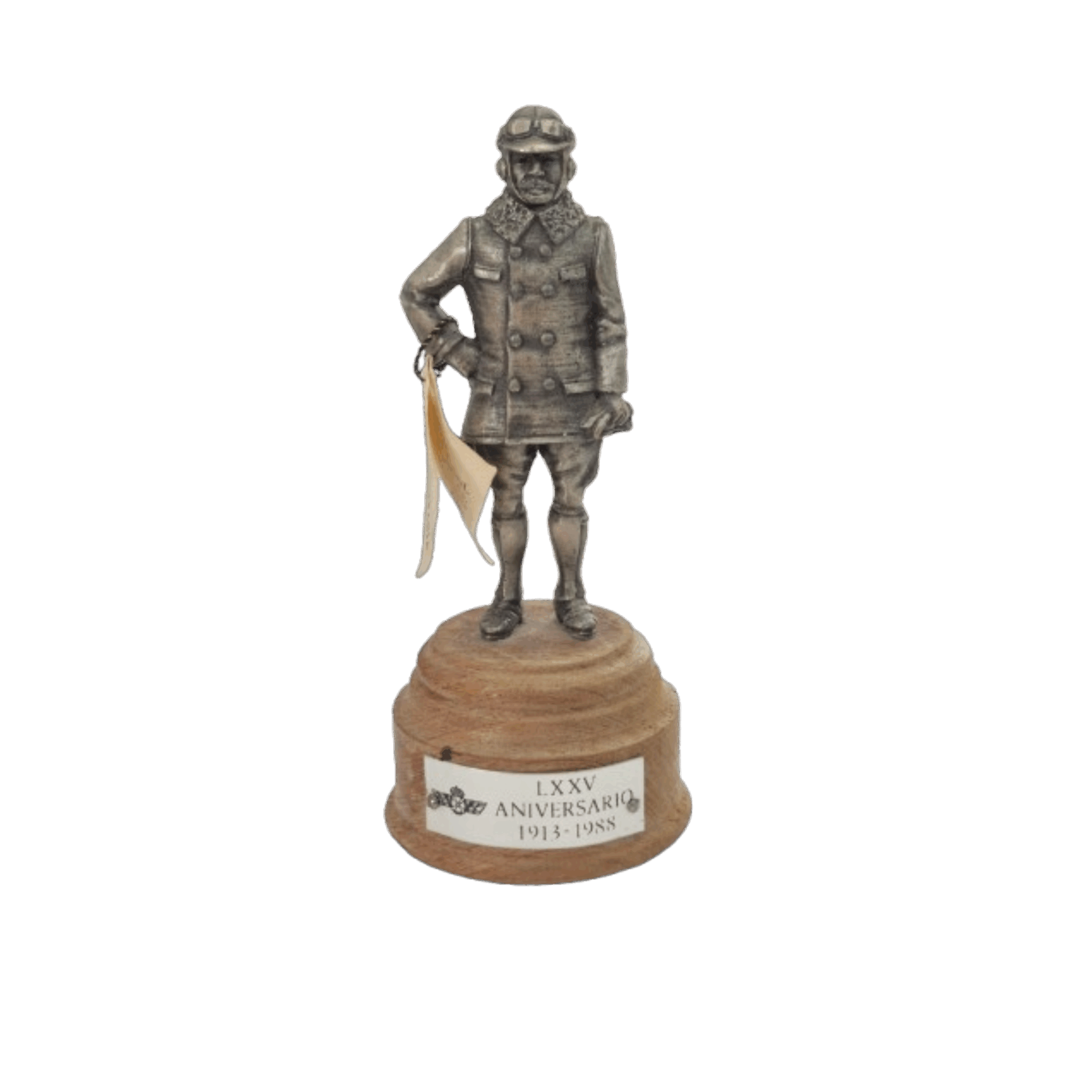 Elegante estatuilla de metal que representa a un aviador con vestimenta de época, sobre una base de madera torneada con placa grabada “LXXV Aniversario 1913–1988”. Realizada para celebrar los 75 años de un acontecimiento relacionado con la historia de la aviación, esta pieza combina encanto histórico y valor de coleccionismo. Excelente estado de conservación