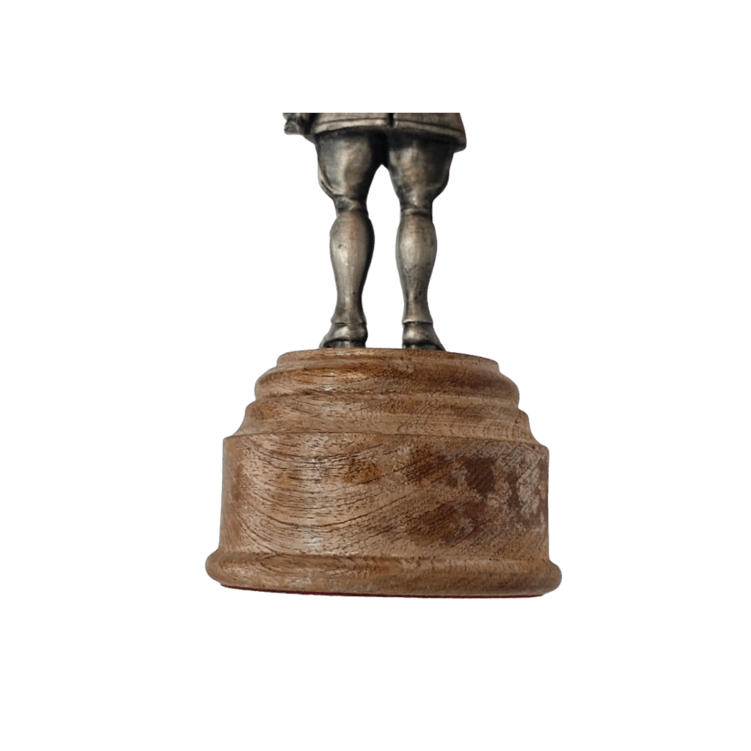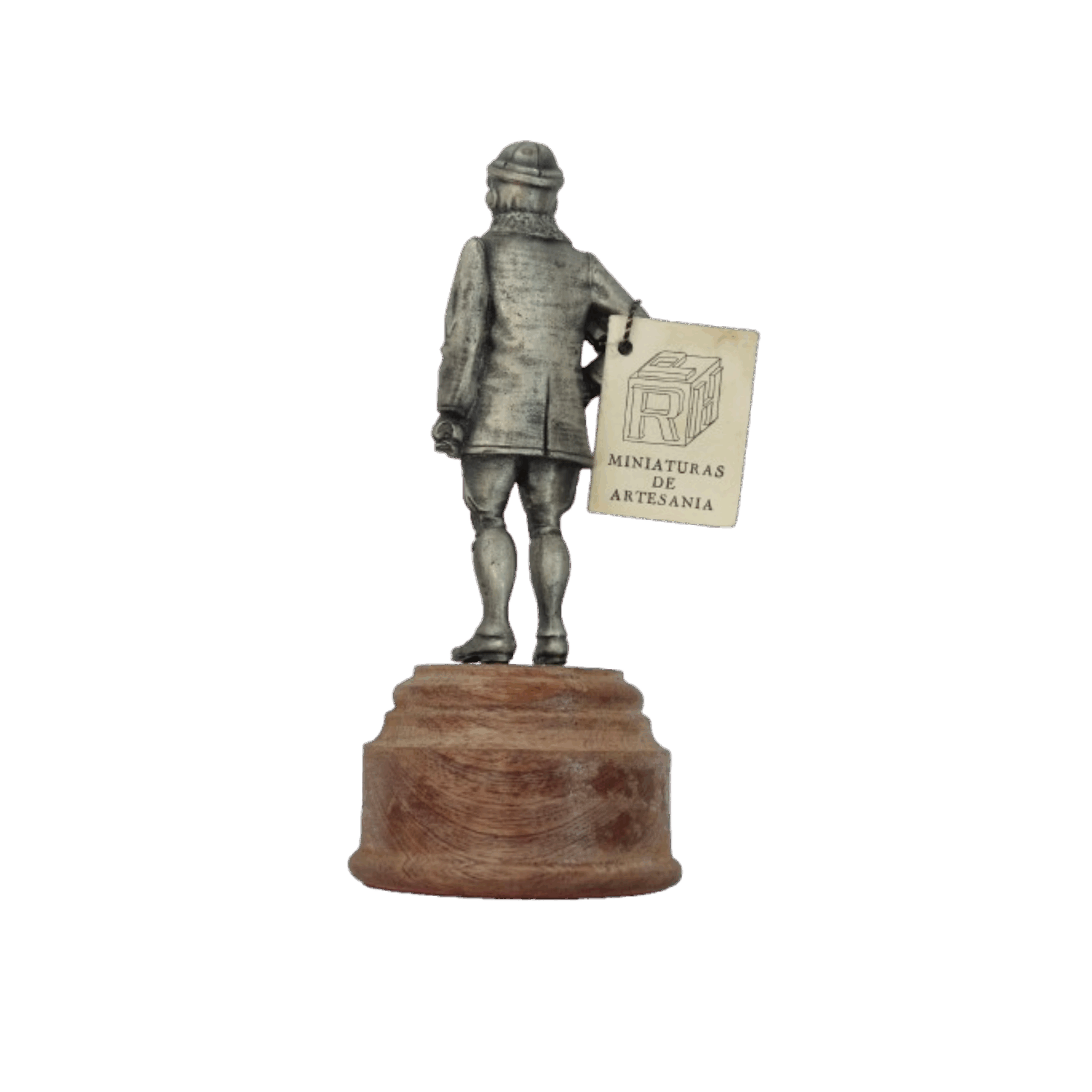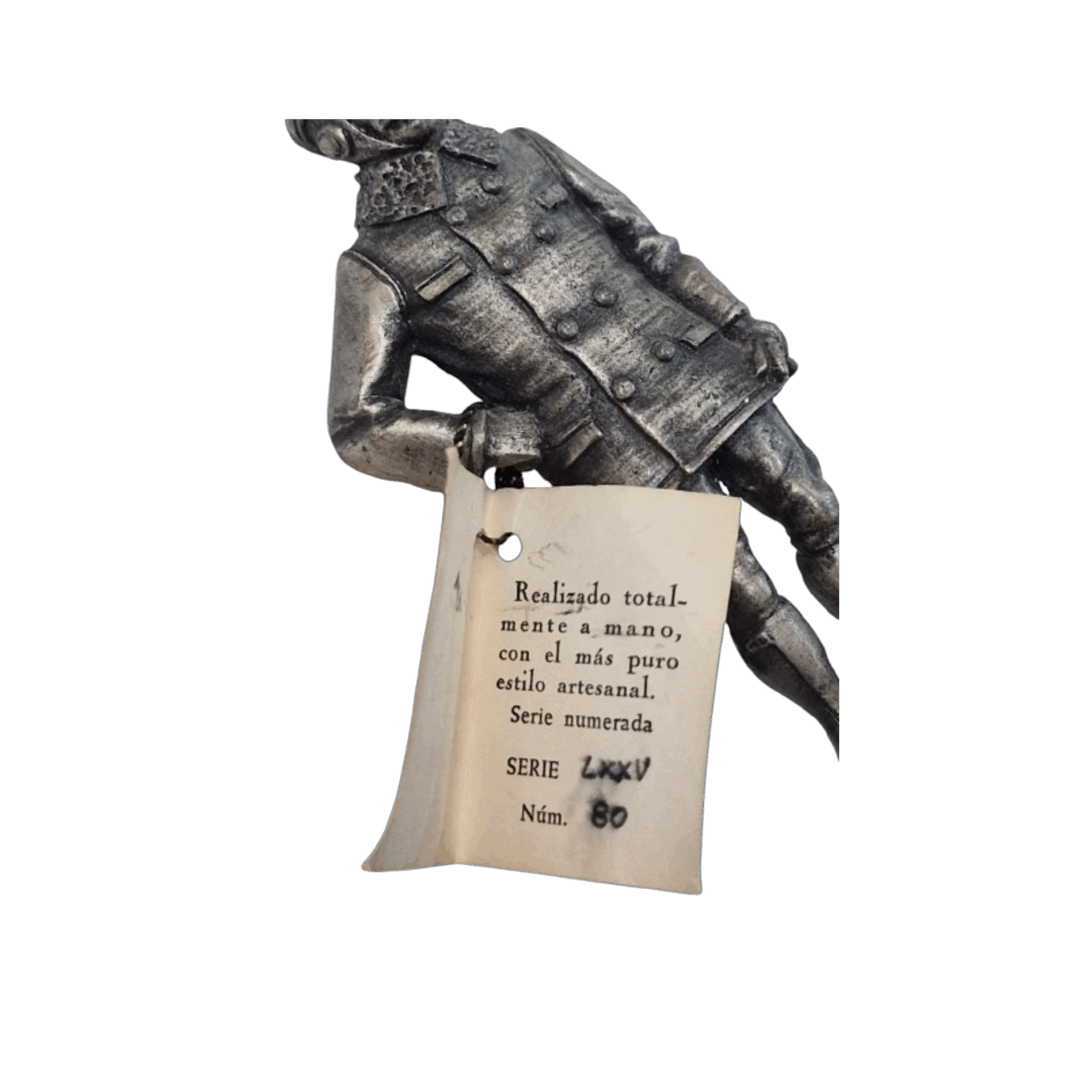 Elegante estatuilla de metal que representa a un aviador con vestimenta de época, sobre una base de madera torneada con placa grabada “LXXV Aniversario 1913–1988”. Realizada para celebrar los 75 años de un acontecimiento relacionado con la historia de la aviación, esta pieza combina encanto histórico y valor de coleccionismo. Excelente estado de conservación