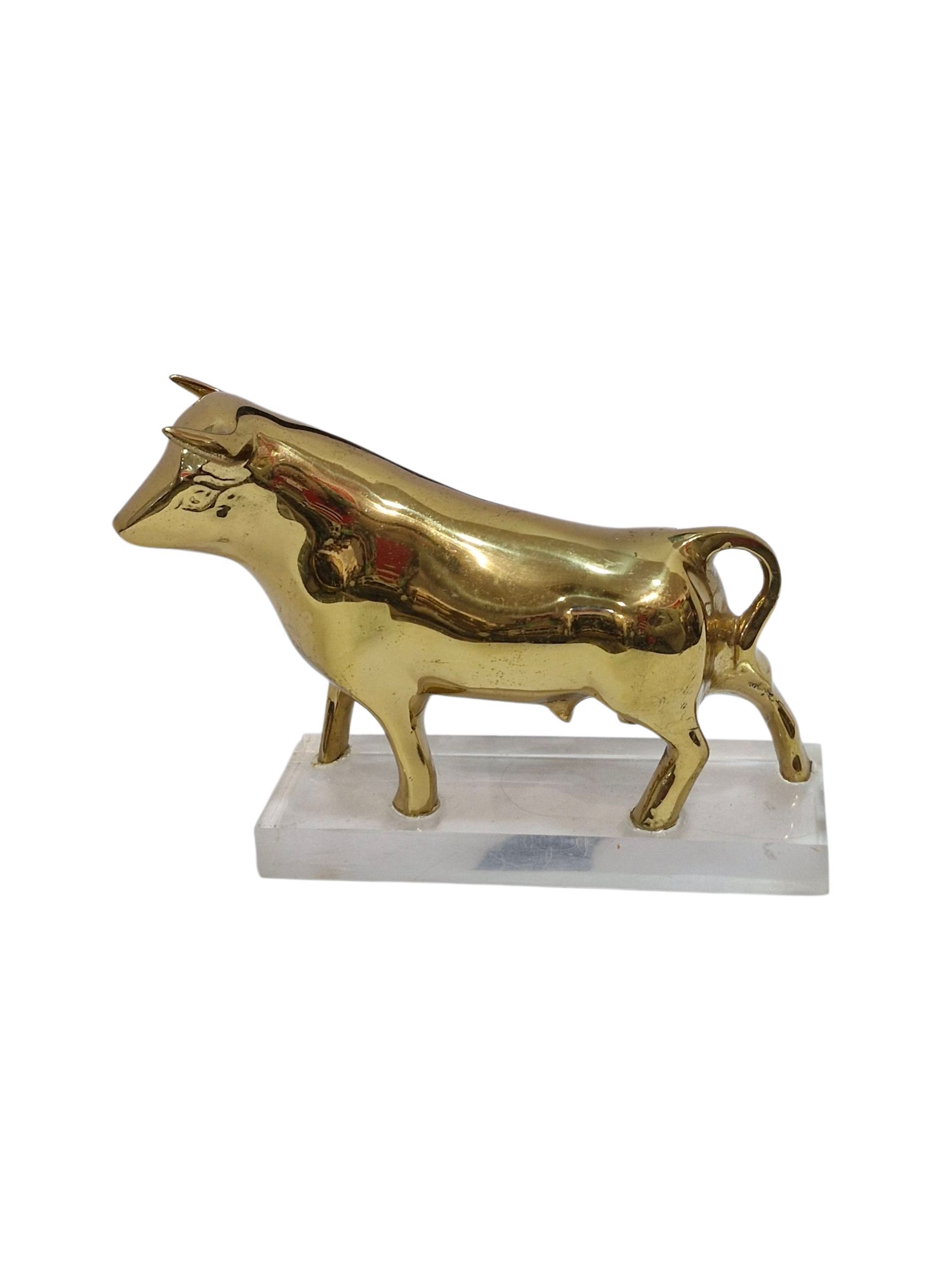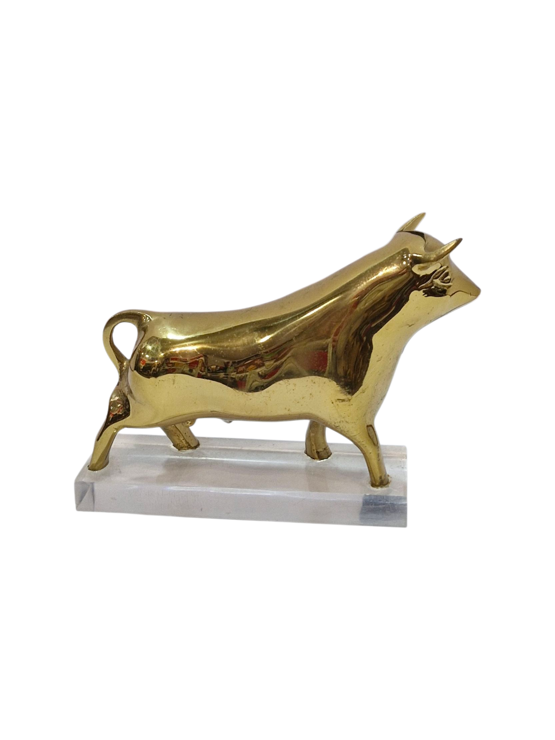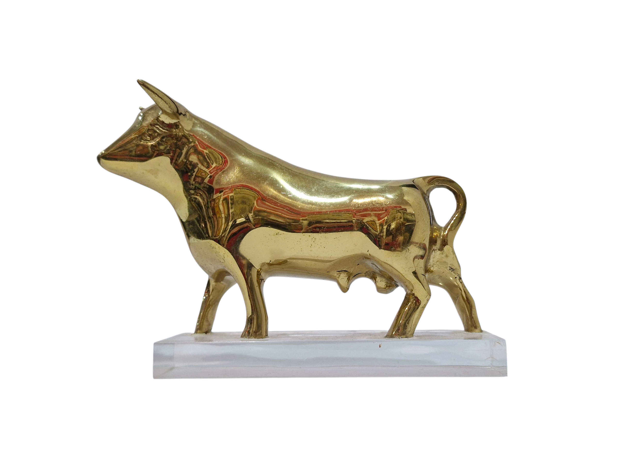 Escultura moderna de toro en acabado dorado brillante, montada sobre base acrílica transparente. Diseño estilizado y minimalista, ideal como pieza decorativa en oficinas, despachos o espacios relacionados con el mundo financiero. Representa fuerza, optimismo y tendencia alcista en los mercados. Perfecta para regalar o coleccionar.