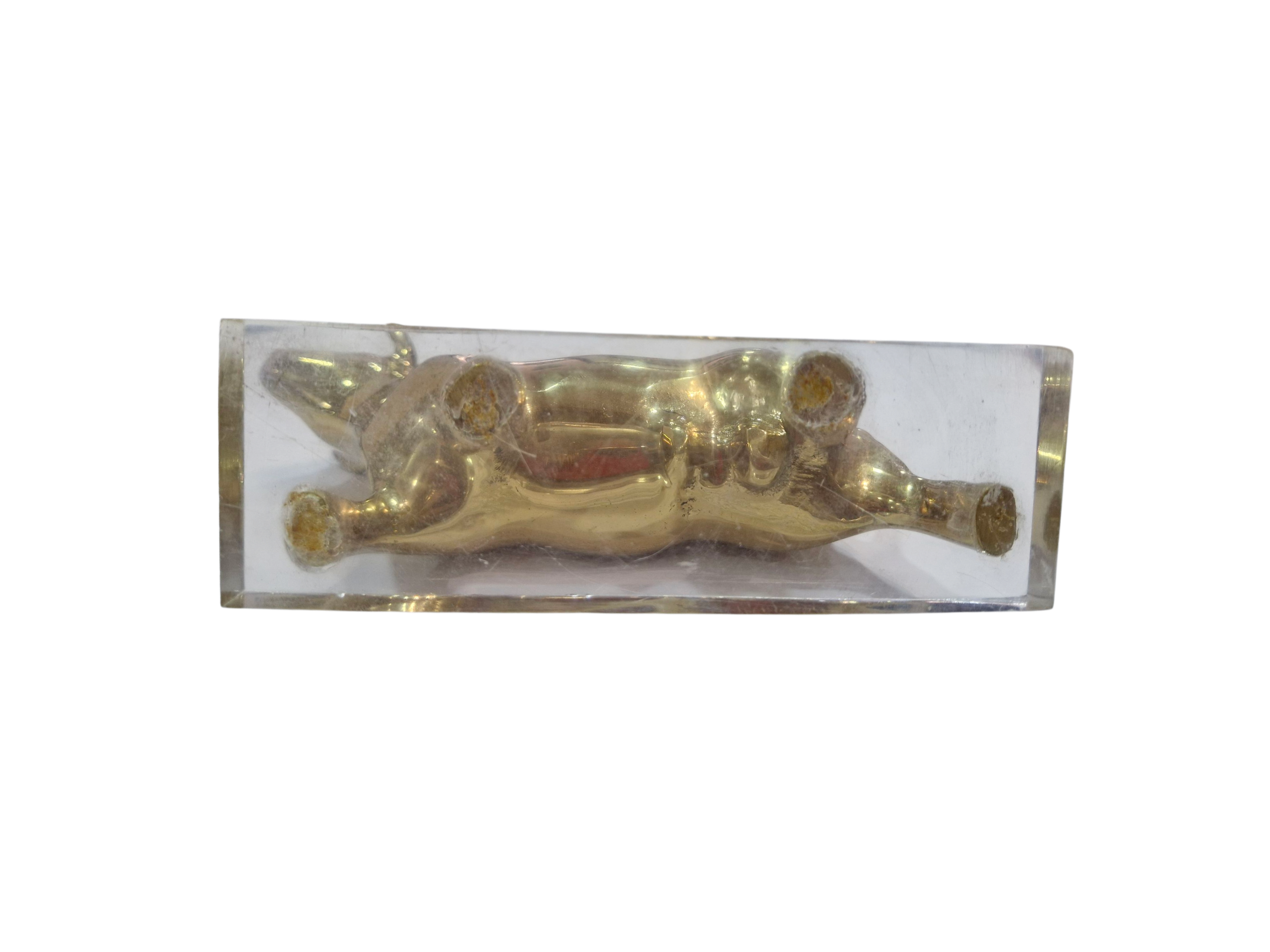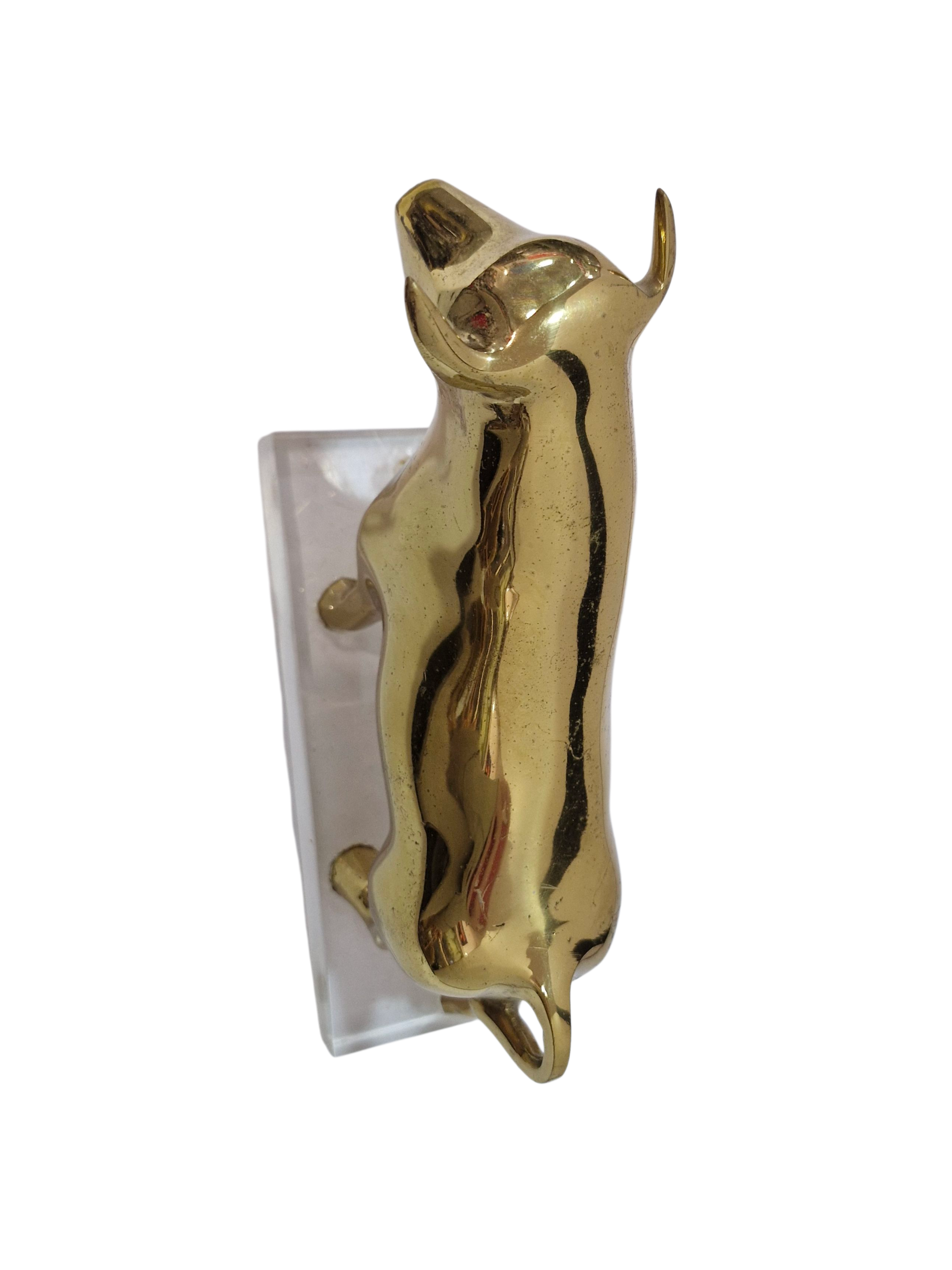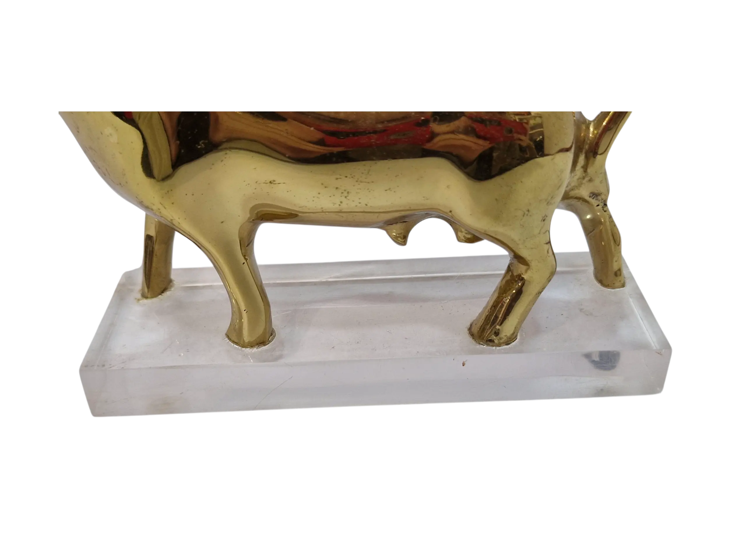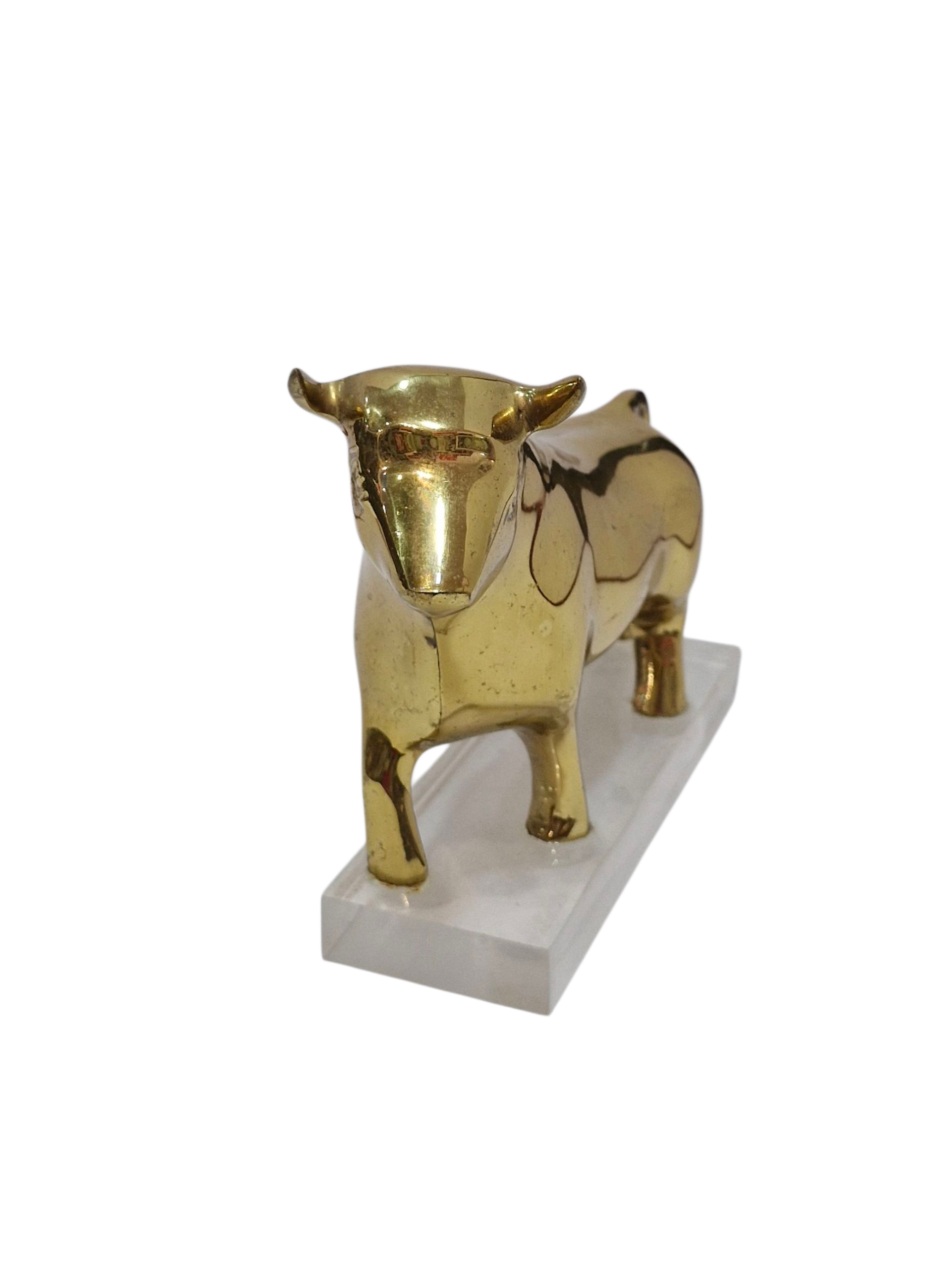 Escultura moderna de toro en acabado dorado brillante, montada sobre base acrílica transparente. Diseño estilizado y minimalista, ideal como pieza decorativa en oficinas, despachos o espacios relacionados con el mundo financiero. Representa fuerza, optimismo y tendencia alcista en los mercados. Perfecta para regalar o coleccionar.