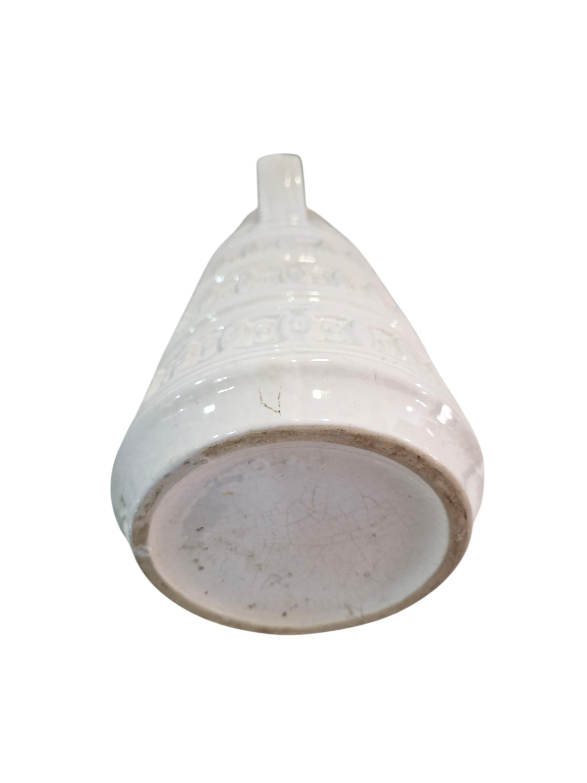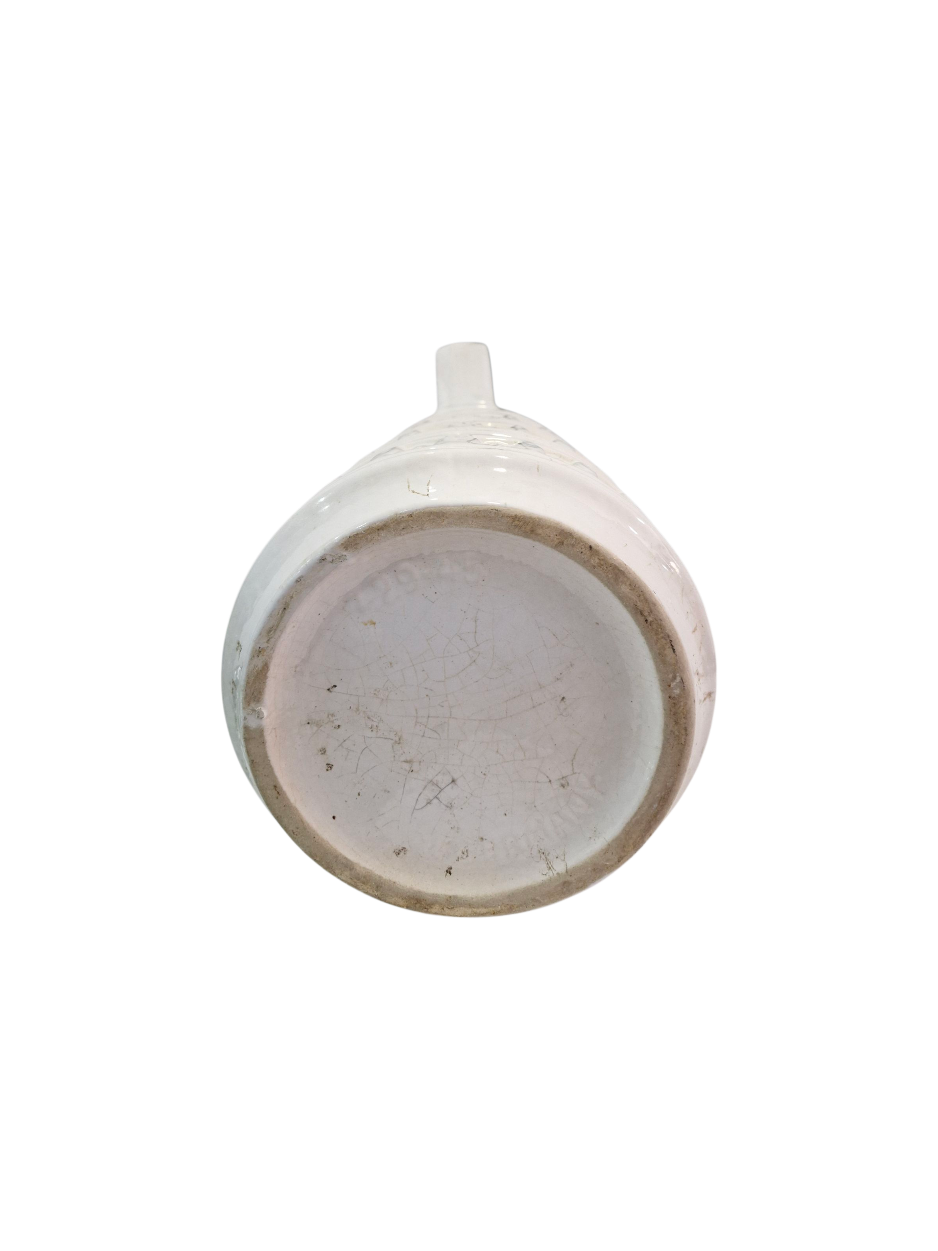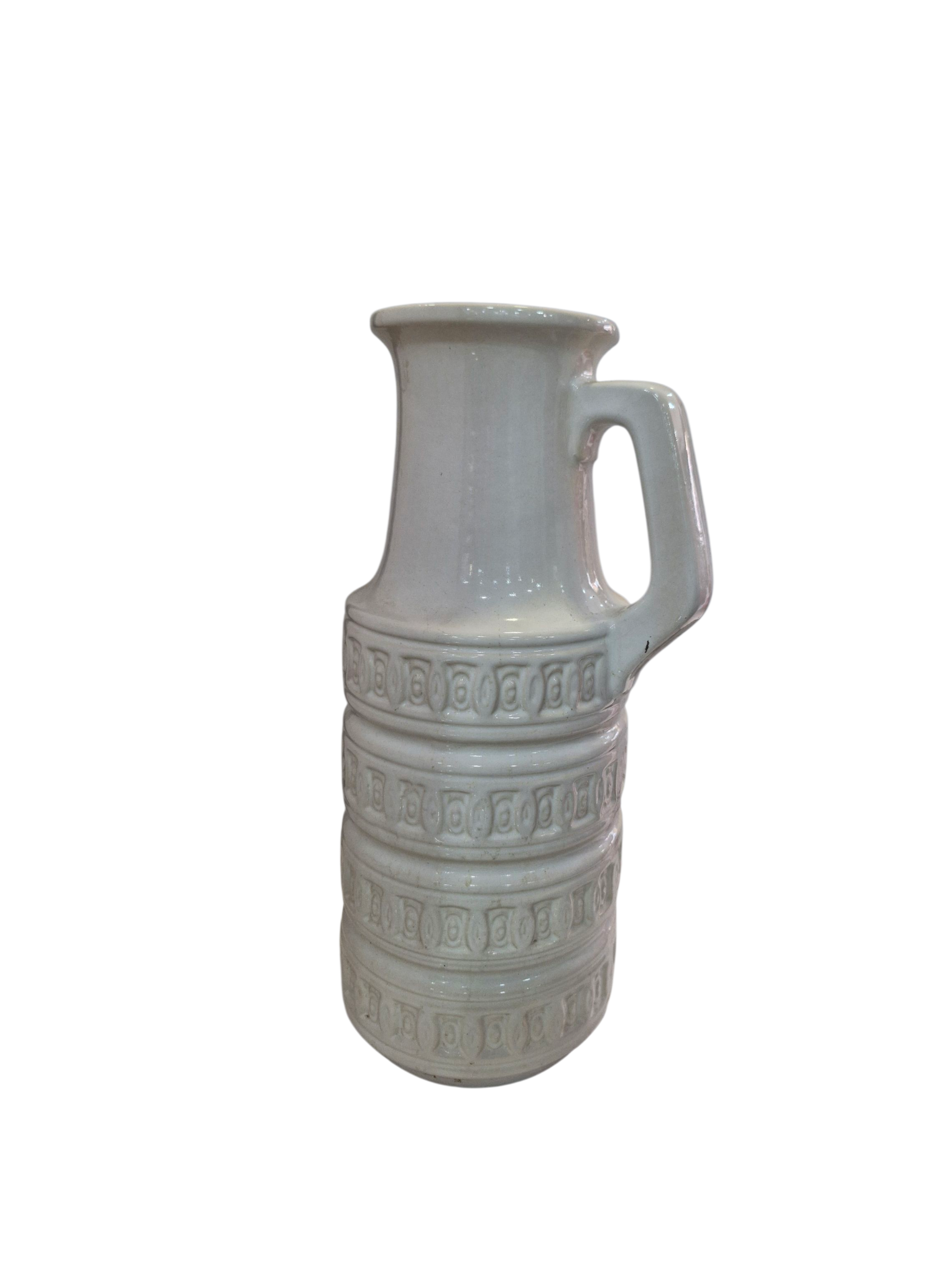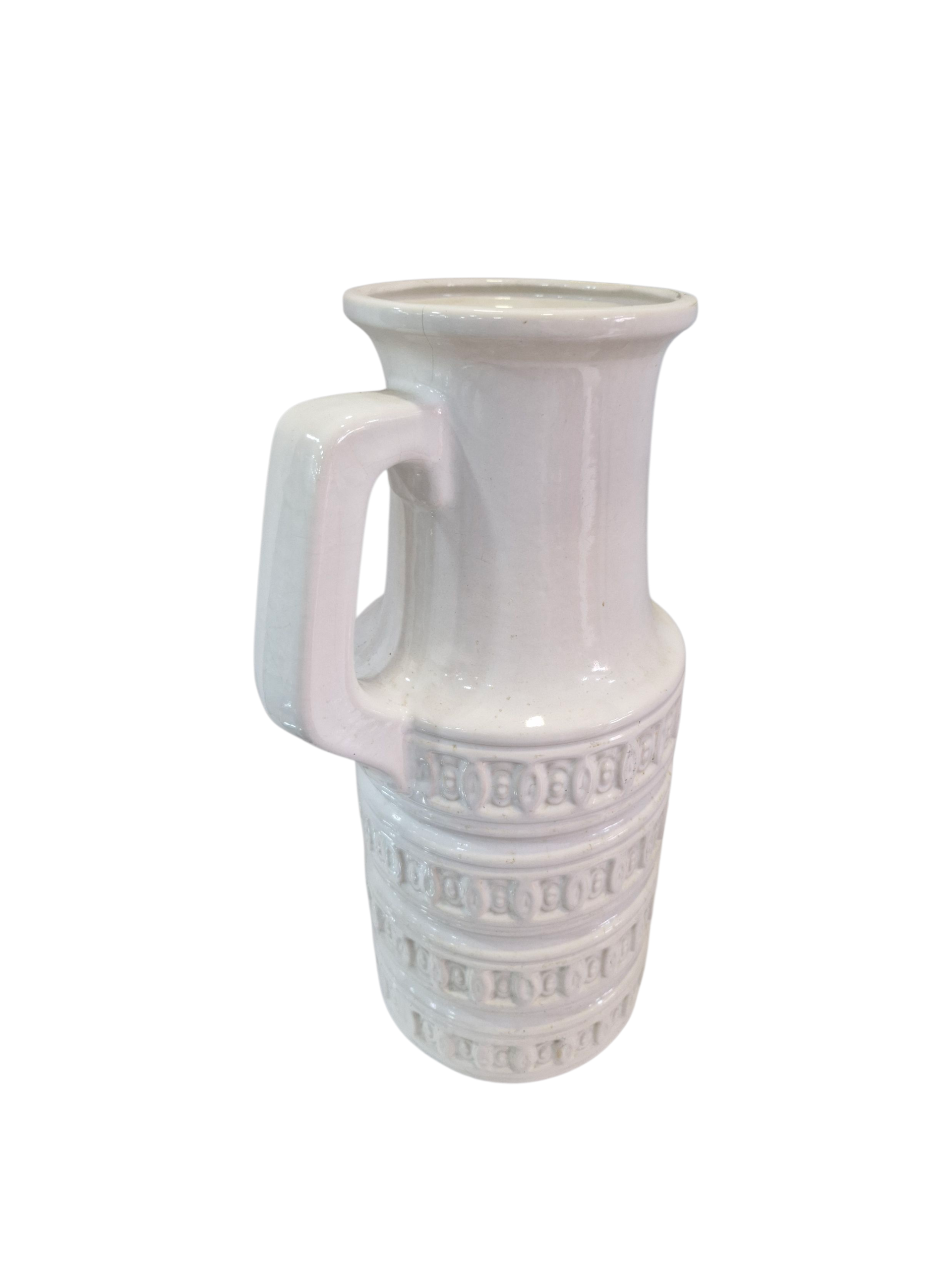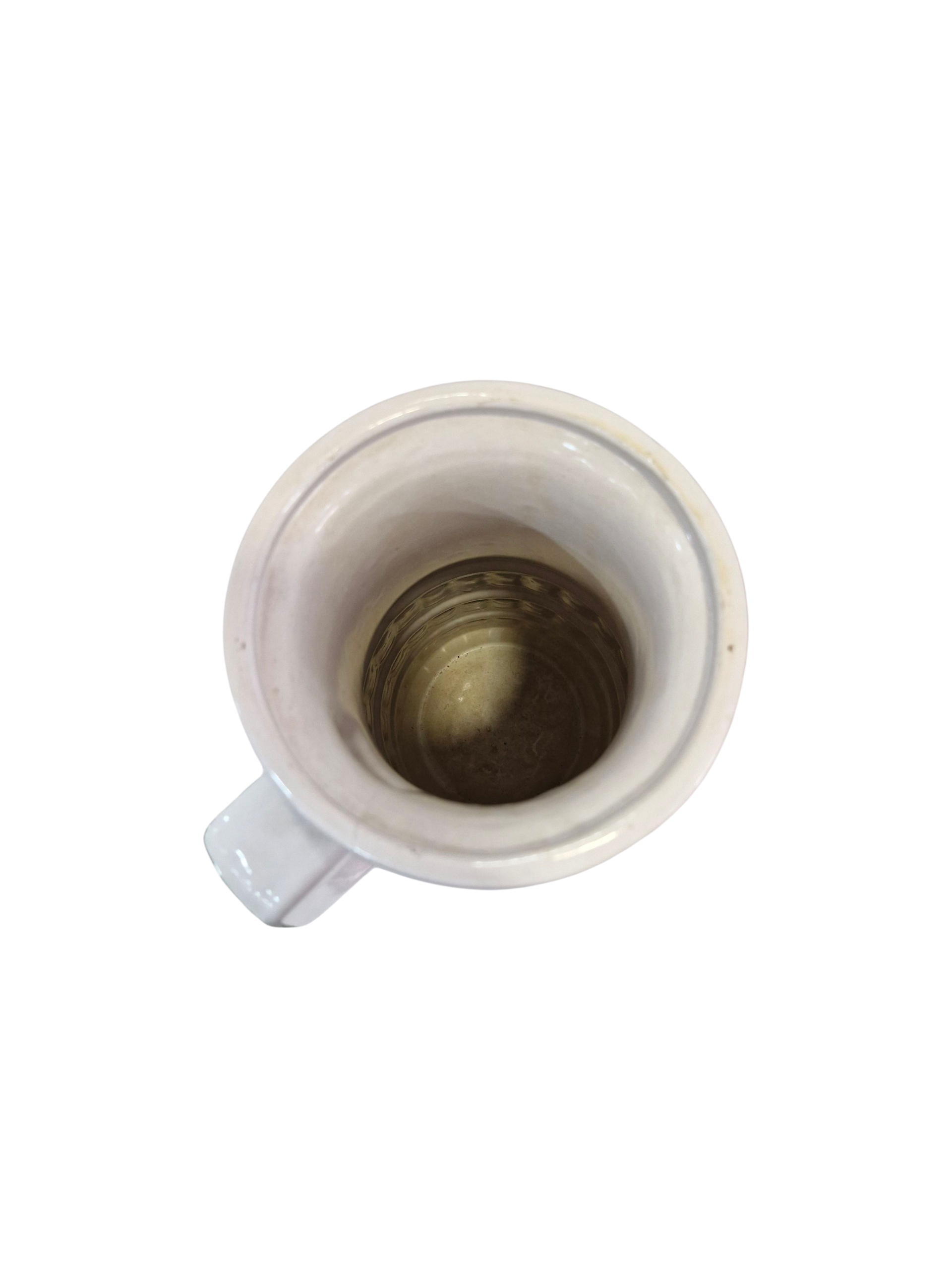 Jarra de cerámica esmaltada en blanco con diseño cilíndrico y asa robusta. Decorada con bandas en relieve de forma ovalada en la parte inferior. Ideal para servir líquidos o como elemento decorativo en ambientes rústicos o vintage. Pieza artesanal con encanto sencillo.