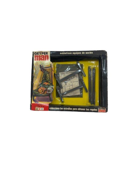 La Litera de Campaña es un set que incluye una litera plegable y otros accesorios para recrear escenas de campo.En el interior son visibles los componentes para ensamblar una litera miniatura para la figura de acción, así como una hoja de instrucciones o un folle.