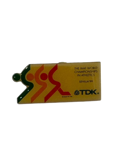 Pin coleccionable del Campeonato Mundial de Atletismo organizado por la IAAF en Sevilla en 1999. El diseño presenta figuras estilizadas en movimiento sobre fondo colorido, junto al logotipo de TDK, patrocinador principal. Este pin es una pieza única para aficionados al deporte, memorabilia olímpica y coleccionismo internacional.