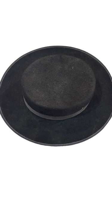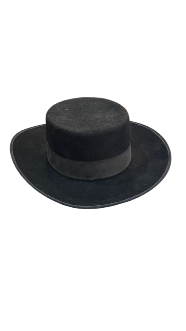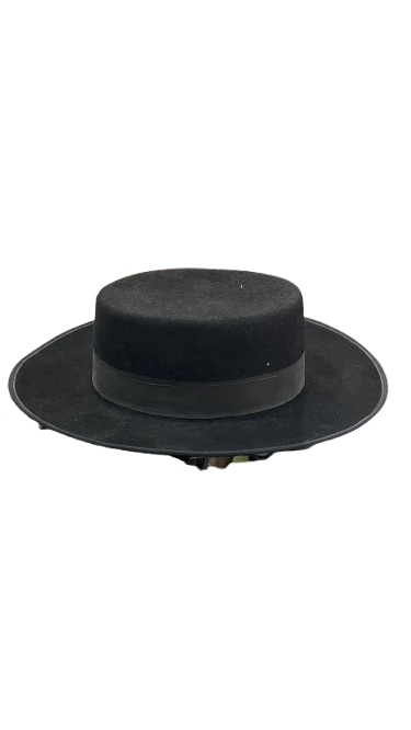 Este elegante sombrero cordobés de color negro presenta un ala ancha y plana junto con una copa baja y cilíndrica. Fabricado en fieltro, ofrece un acabado sofisticado y tradicional, ideal para atuendos clásicos o eventos especiales. La cinta negra que rodea la base de la copa aporta un toque distintivo y auténtico.