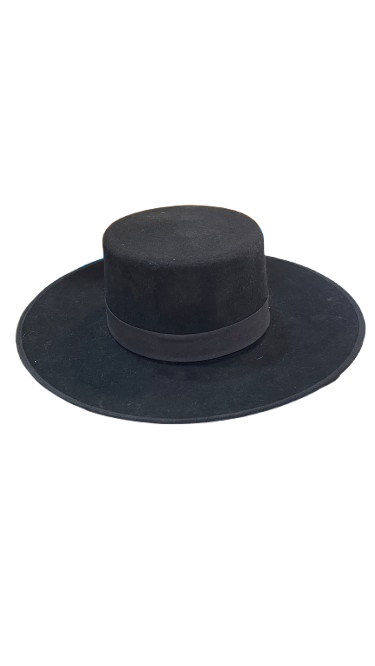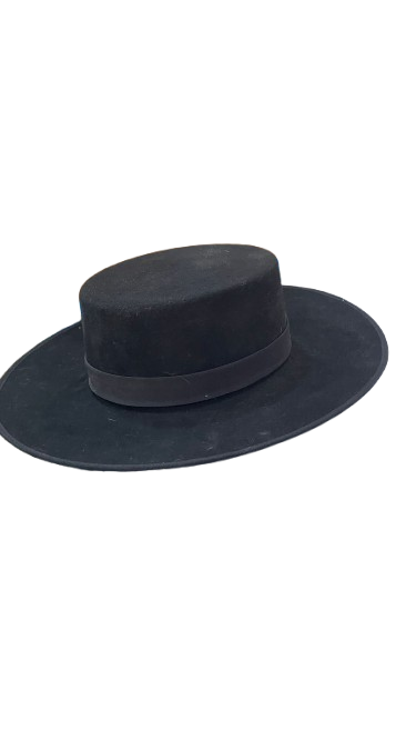 Este elegante sombrero cordobés es un clásico de la moda andaluza. Fabricado en fieltro negro, destaca por su copa alta y plana, su ala ancha y rígida, y su distintiva cinta negra en la base. Perfecto para eventos culturales, ferias y espectáculos flamencos, es un accesorio imprescindible para quienes desean llevar un toque de tradición con estilo.