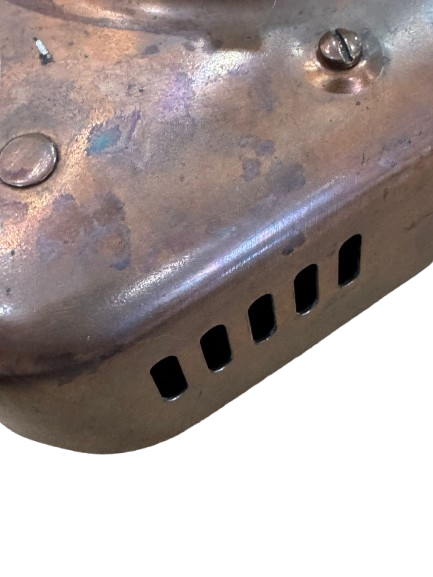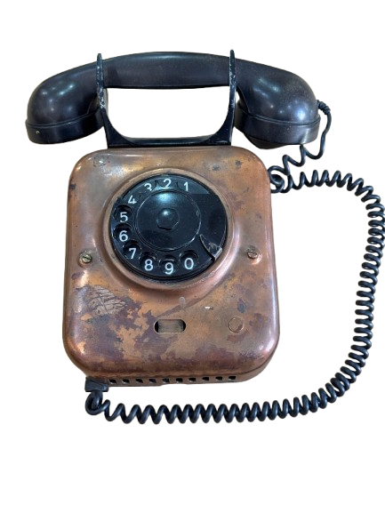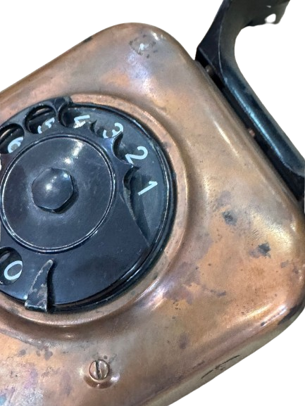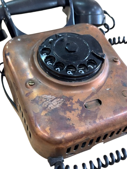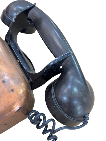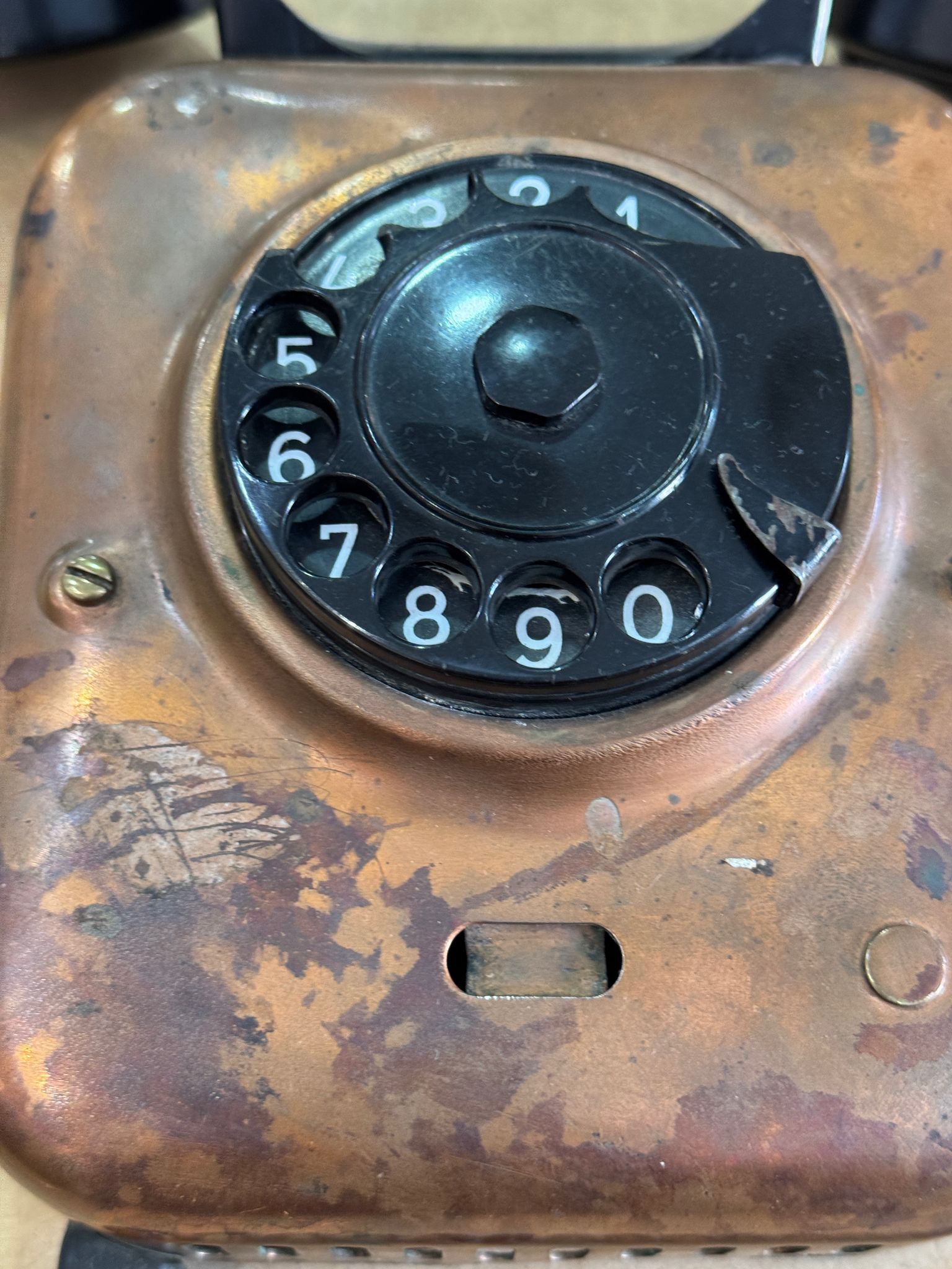 Telefono antiguo de pared. Fabricado en cobre. Funcionando. Desperfecto en el disco de marcacion.