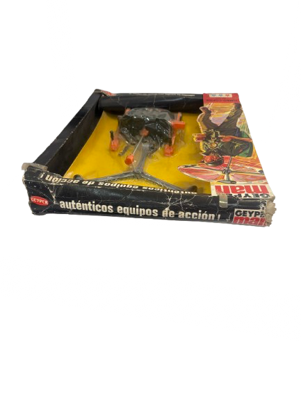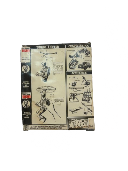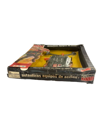 En la caja es visible una ilustración de un personaje Geyperman volando con el Turbo-Copter y el juguete mismo dentro del paquete transparente.